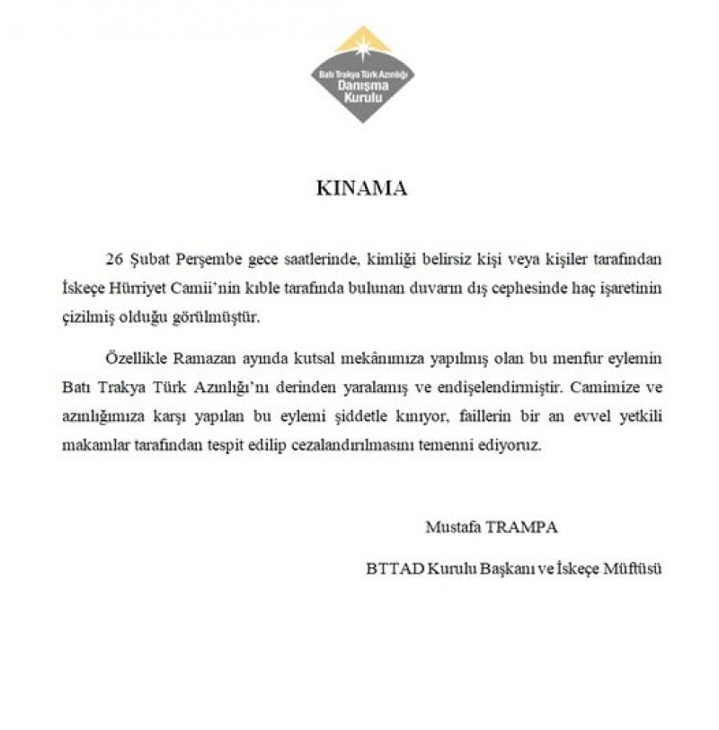 kutsal mekânımıza yapılmış olan bu menfur eylem Batı Trakya Türk Azınlığı’nı