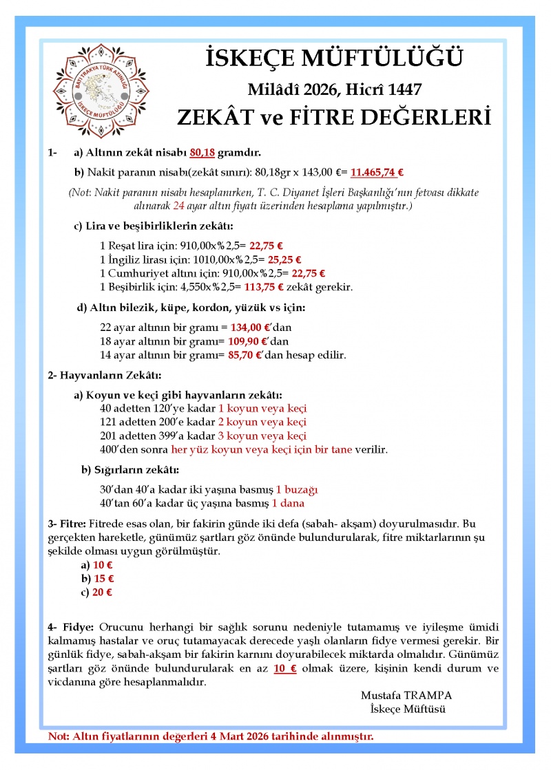 İskeçe Müftülüğü tarafından yapılan değerlendirmeye göre günümüz şartları dikkate alınarak fitre miktarlarının şu şekilde olması uygun görülmüştür: