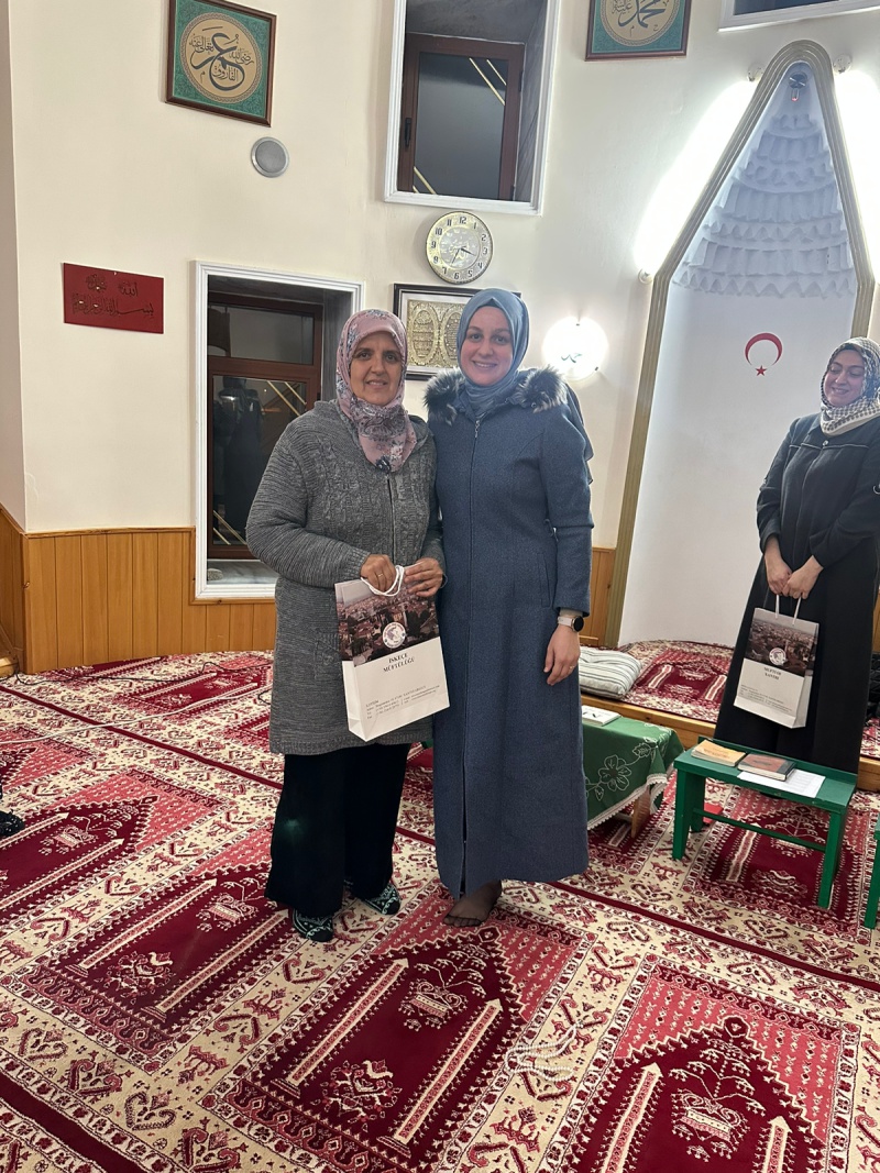İnhanlı Camii’nde, Regaip Kandili programı 19 Ocak 2023 Perşembe günü gerçekleştirildi. İskeçe Müftülüğü Vaiz Din Eğitimcileri Bahar Müminoğlu, Selin Sebahattinoğlu, Büşra Bıçakçı ve Din Eğitimcisi Merve Farzlı’nın hazırlamış olduğu Kur’an-ı Kerim tilaveti, ilahiler, vaaz, hadis-i şerifler ve duanın yer aldığı programla Regaib Kandili ihya edildi. Ardından Kur’an-ı Kerim’i okumaya başlayan dört yetişkin kadına hediye takdim edildi ve Müftümüzün tebrikleri iletildi. Program kadın soydaşlarımıza hediye ve ikramlıkların dağıtılmasıyla son buldu.